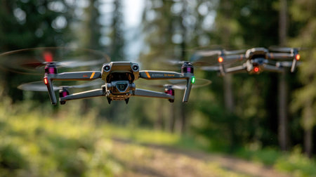 Two drones are captured mid-flight, showcasing their design and functionality. The image highlights the details of the devices against a soft focus, natural environment. The scene is illuminated by sunlight, suggesting an outdoor setting suitable for various media applications such as advertising or editorial content.
