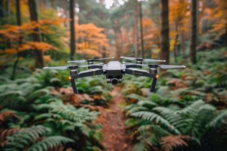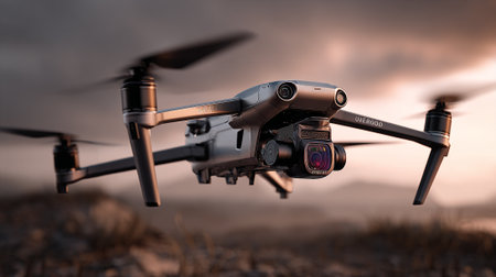 An advanced drone featuring a high-quality camera is flying outdoors, potentially capturing landscape footage. The drone is the focus, showcasing its design and functionality in a scenic environment.