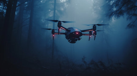A black drone hovering mid-air over a forest, with a dramatic sunrise in the distance.
