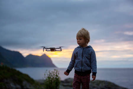 Silhouette of little toddler child, catching drone in the air, standing on a rock, splendid beautiful mountain landscape from Husoy village on Senja island behind him