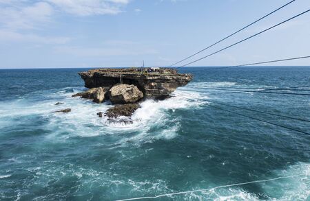 Yogyakarta,Indonesia,April 2016:-A man who was riding gendola across ocean to a small rocky island called Timang.The gendola made of rope and wood spikes usually operated manually by local resident.