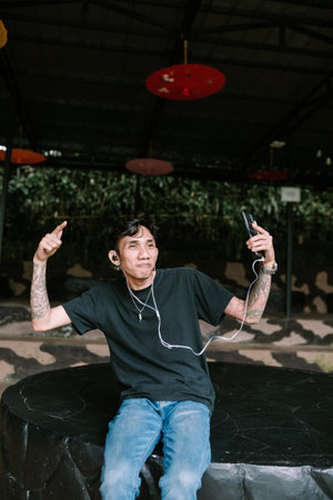 Southeast Asian man enjoying music through earphones, with a relaxed and content expression. Ideal for themes of leisure, personal entertainment, or modern lifestyle.