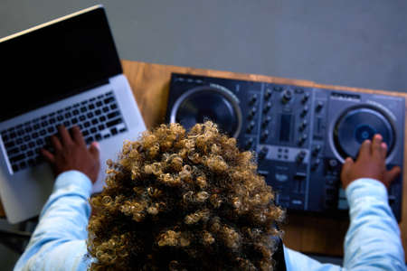 Curly haired African American stands behind DJ table, on which there is professional musical equipment. DJ console for staging tracks in a cube and a personal computer for which the musician works
