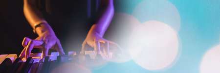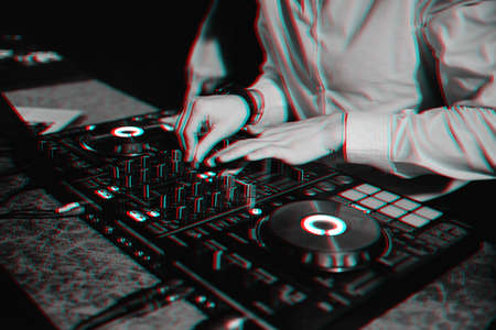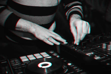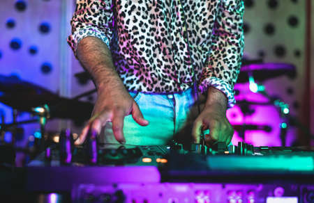 Close up view of DJs hands that working with music equipment in the club with neon lighting
