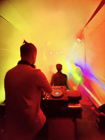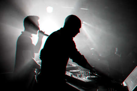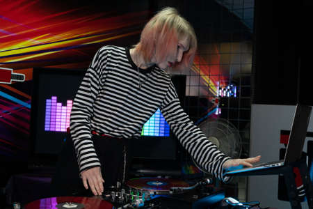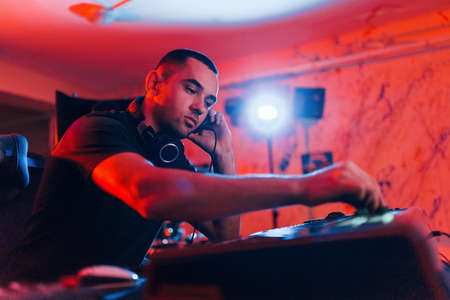 Dj mixes the track in the nightclub at party