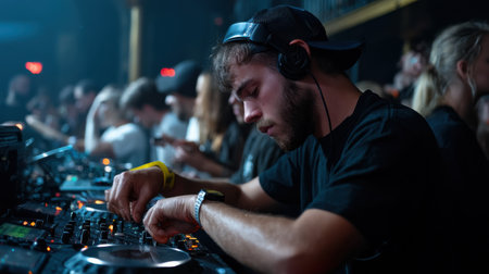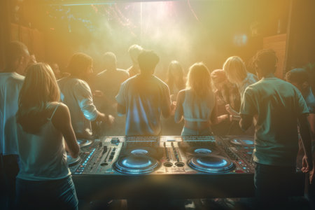 Group of young people standing in front of a DJ booth, watching a famous DJ spin records and mix tracks, surrounded by a sea of dancing bodies. Generative AI