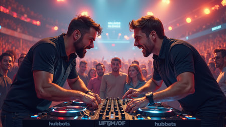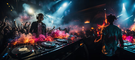 Two enthusiastic DJs engage with each other while spinning electrifying tracks in a packed nightclub. The vibrant crowd dances, immersed in the pulsating energy of the night.