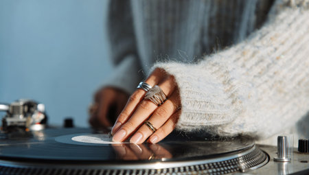 An individual's hand, adorned with rings, interacts with a record player. The image displays a soft, neutral color palette with a textured sweater. The composition focuses on detail and evokes a sense of leisure. Suitable for content related to music, hobbies, and lifestyle.