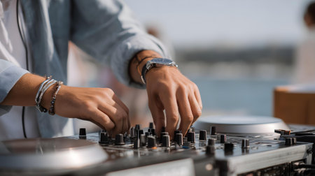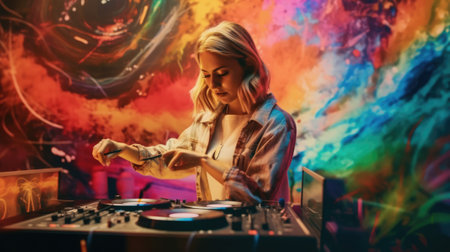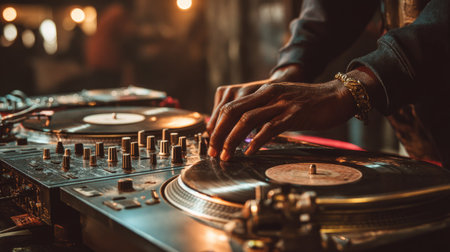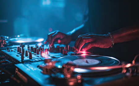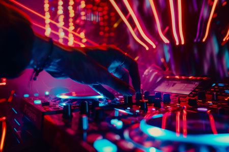 A DJs skilled hand expertly adjusts the various controls amidst vibrant neon lights and an energetic atmosphere. Generative AI