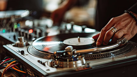 A close-up captures a person's hands manipulating a vinyl record on a turntable. The scene showcases a vintage or modern music setup, possibly indoors. The composition features shallow depth of field, with soft focus on some areas. This image is suited for illustrating music-related themes.
