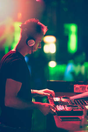 Dj mixes the track in nightclub at party