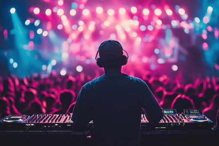 A DJ is seen at a live music event, using a mixing console. The composition features close-up details of the equipment and a hand on the controls, with a background of blurred lights and an audience. This image would be suitable for promotional materials or editorial content related to music events and nightlife.