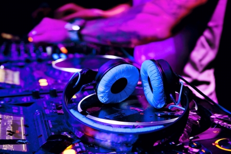 Dj mixes the track in nightclub at party DJ headphones