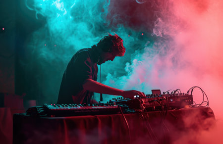 dj in smoke by neon light.