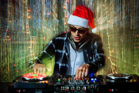 DJ mixing up some Christmas cheer. Disco lights in the background.