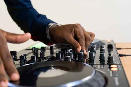 Hands of African American guy in sweatshirt adjusting dj controller while creating new music for entertainment event against his girlfriend