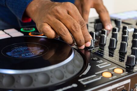 Close-up image of male hands, dj making sounds at night club party with professional sound mixer