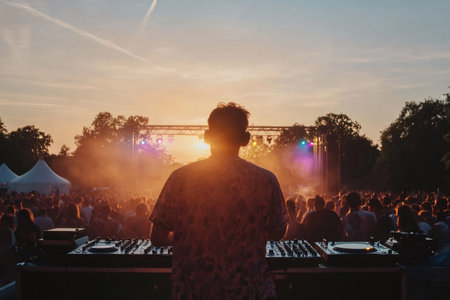 Disc jockey mixing music at sunset during a festival with crowd partying in front of the stage