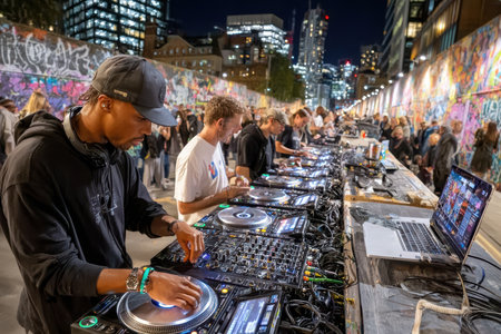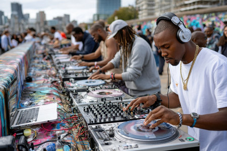 Several DJs are mixing music together in an energetic outdoor setting, showcasing their skills.