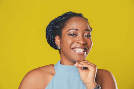 Close up portrait of a young African American woman smiling on yellow background