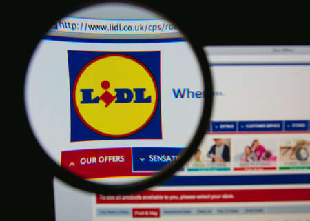 LISBON, PORTUGAL - JANUARY 30, 2014: Photo of Lidl homepage on a monitor screen through a magnifying glass.