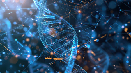 Stunning visualization of a blue DNA helix surrounded by glowing particles and connective lines, symbolizing the intersection of science and technology in genetics.