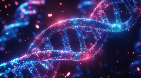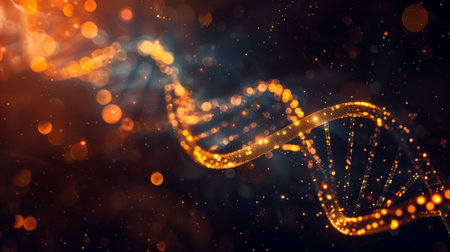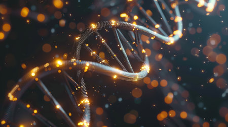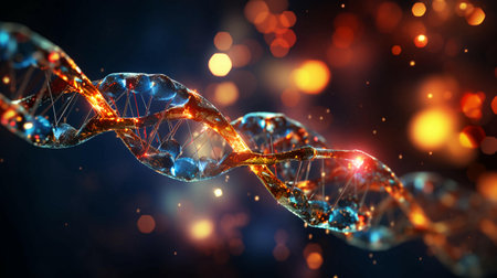 Beautiful and luminous digital artwork depicting a DNA strand, symbolic of genetics and biotechnology