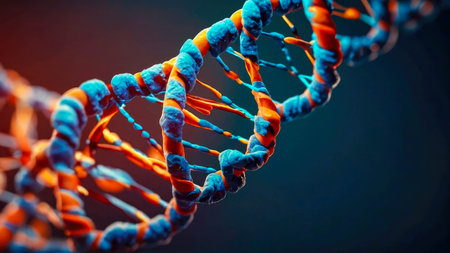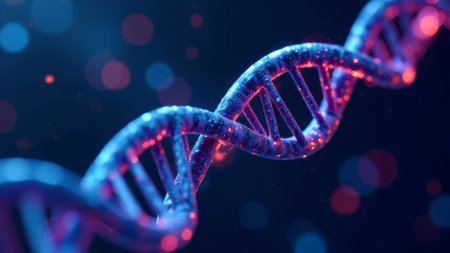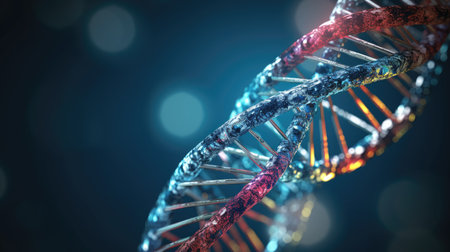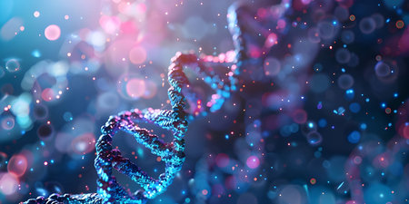 Colorful representation of DNA strands with detailed molecular structures illuminated by soft light in a scientific and artistic composition