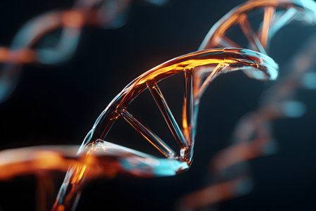 Detailed 3D rendering of a DNA double helix structure against a dark background. This image showcases a close-up view of a DNA strand, highlighting its intricate molecular structure and design.