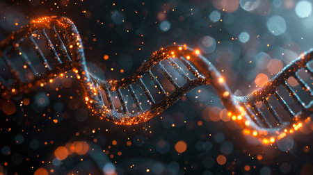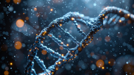 A captivating digital representation of a DNA strand illuminated by glowing particles, symbolizing the essence of life and scientific exploration in genetics and biology.