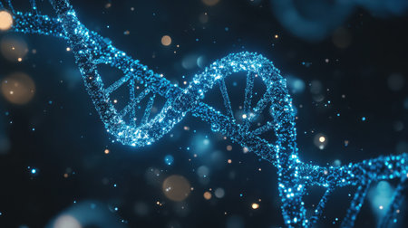 Explore a captivating visual representation of a glowing DNA helix, adorned with sparkling particles, highlighting the essence of molecular biology and genetic research.
