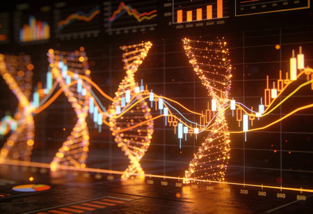 Displaying centered glowing DNA helix in studio, with financial charts overlaying and faint skyline. Visualization, data, candlestick, bar, trend, grid, layered