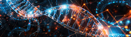 An intricate close-up view displays advanced genetic structures interconnected in a futuristic design. The molecular patterns highlight the beauty of science and technology.