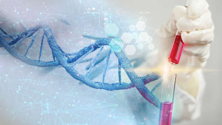 DNA molecule, its structure. Concept human genome. DNA molecule with modified genes. Conceptual illustration of a dna molecule inside a glass test tube with liquid. Medical equipment. 3D illustration