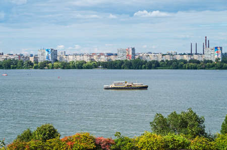 Pleasure motor ship sails along the river against backdrop of multi-storey residential area, cloudy sky and coastline