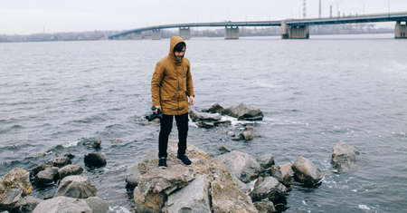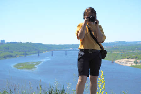 Girl with a camera in the summer on the street in sunny weather. high quality photo