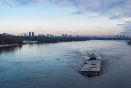 The barge floating in the Dnieper river. Kyiv city landscape in the background.