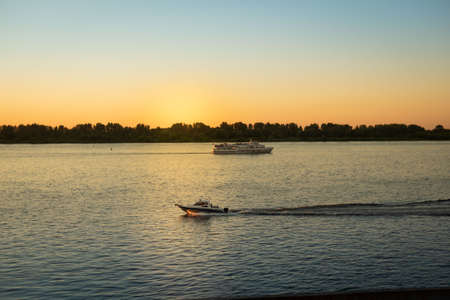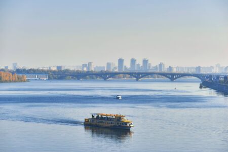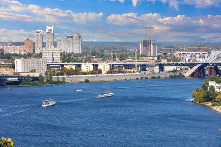 Dnipro river with pleasure boats plying along the city embankment of Kiev on a bright summer day against the background of a beautiful sky and cityscape.