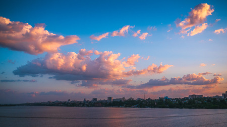 Clouds in beautiful evening light over water reservoir or river in Voronezh, Russia