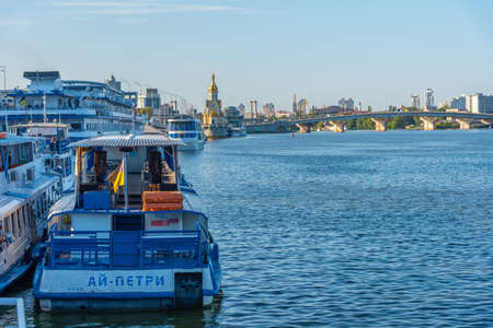KYIV, UKRAINE, AUGUST 29, 2019: Tourist boats and riverside of Dnieper in Kyiv, Ukraine