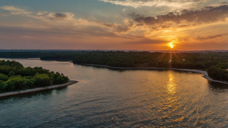 Arial view over the river and small village at sunset. Dniester river of Moldova republic.