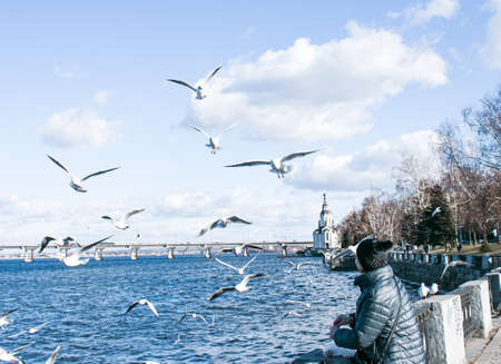 Woman feeding ducks and seagulls on the waterfront in the city. In winter, the birds are hungry.
