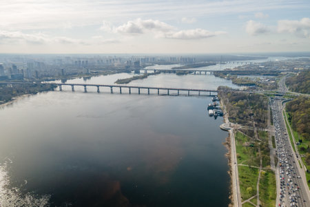 All-welded steel road bridge with concrete suppors across river, view from left bank. Paton Bridge​ across Dnieper River, Kyiv, Ukraine