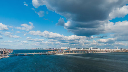 Beautiful view from drone to Dnipro city, river, bridge and scenic sky with clouds.