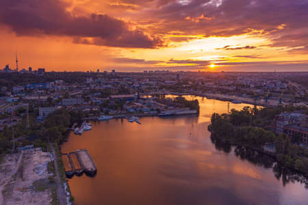 Dramatic colorful sunset over Dnipro river in Kiev, Ukraine, travel background