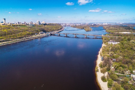 Aerial drone view of Dnepr river and Rybalskiy island from above, bridges and skyline of Kiev city, Ukraine