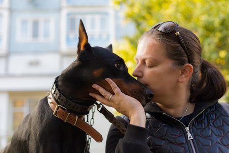 A young woman on a walk with a Doberman is enjoying talking with a pet. Selective focus with blurred background. Shallow depth of field.