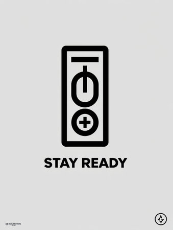 This minimalist poster promotes preparedness with the phrase Stay Ready alongside symbols representing power outages, perfect for contemporary decor.