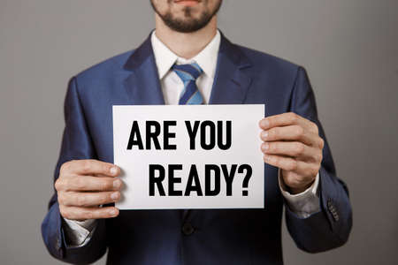 Businessman in blue fashionable business suit holding a white paper with inscription ARE YOU READY. Business, technology, internet and networking concept.