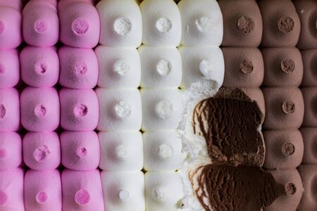 Tasty ice cream with different flavors as background. Frozen yogurt sweet dessert, close up. Summer season backdrop.